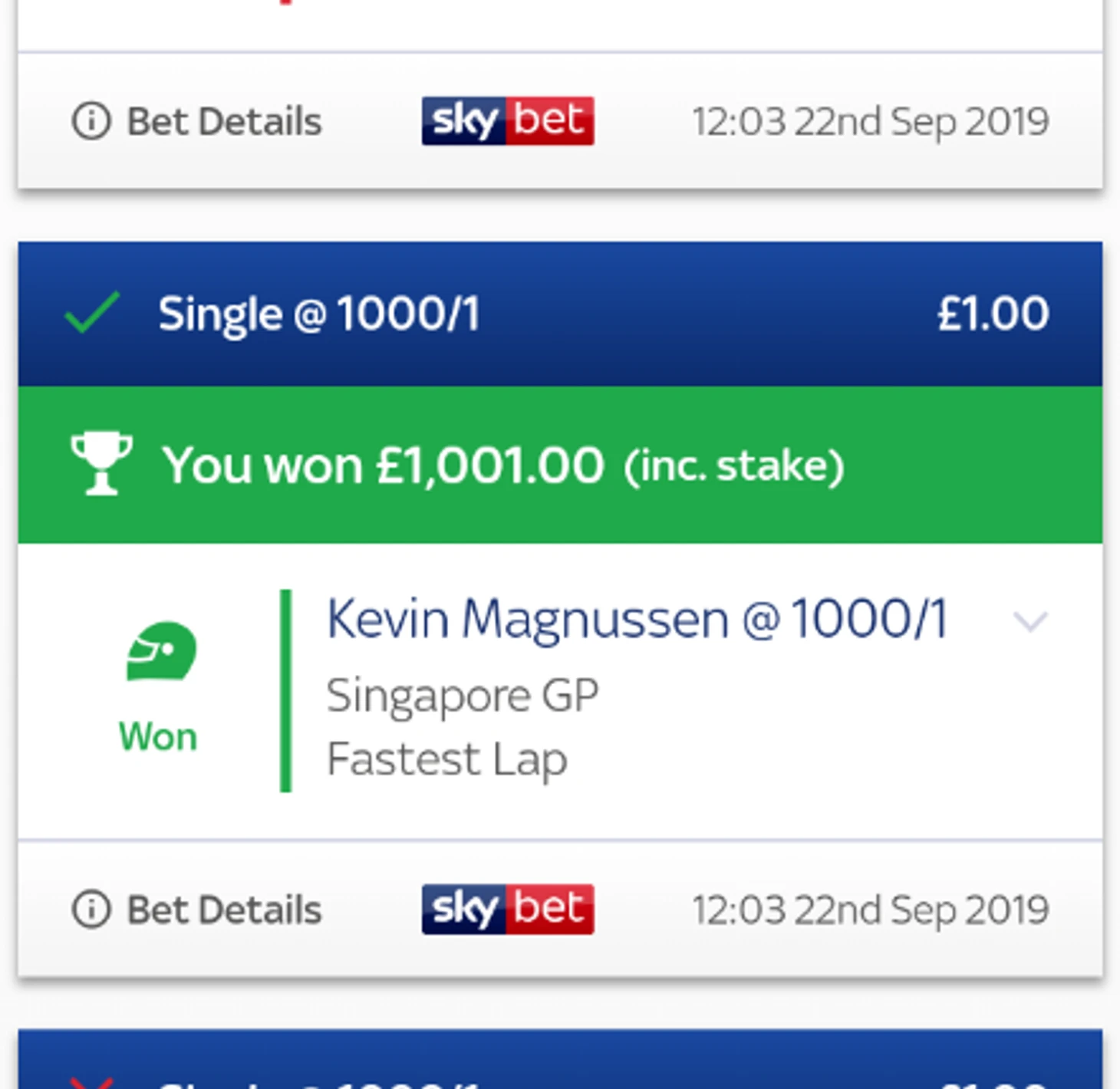 В итоге риск окупился: Кевин в самом деле поехал в боксы на 57-м круге, получил новые шины и установил лучший круг. Коэффициент на такой исход равнялся 1001, так что Vafanculoo выиграл 1000 фунтов (1227 долларов)!