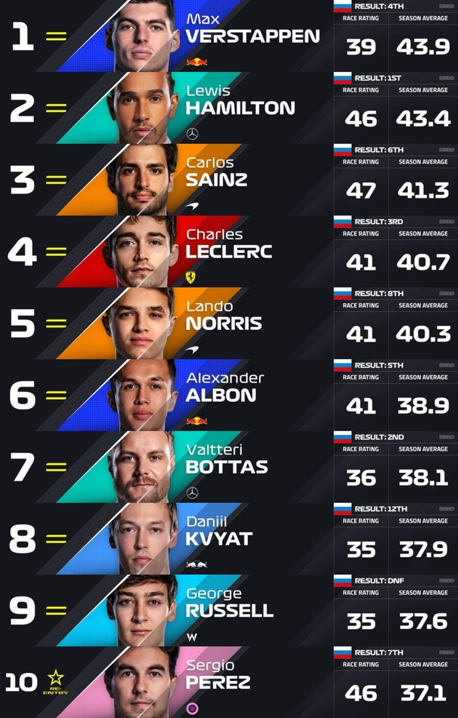 Судя по видимым оценкам, эксперты «Формулы-1» признали лучшими на Гран-при России Карлоса Сайнса, Льюиса Хэмилтона и Серхио переса..