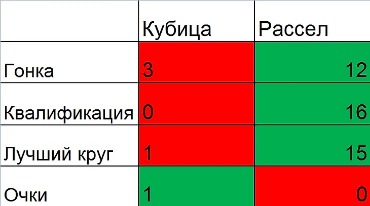 Роберт уступает Джорджу во всем. Единственное, что вышло в пользу поляка – количество очков. Пока у Рассела их вообще нет, у Кубицы набралось целое одно очко, набранное им в дождливой Германии. Правда, важно отметить, что тогда гонщику очень помогли судьи, оштрафовавшие сразу два болида «Альфа Ромео», финишировавших в 10-ке. Как итог, вот что мы получили: