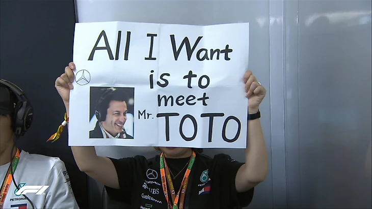 Во время практик на Гран-при Японии телекамеры выловили в боксах «Мерседеса» местную девушку с плакатом «Все, что я хочу – встретить мистера Тото».