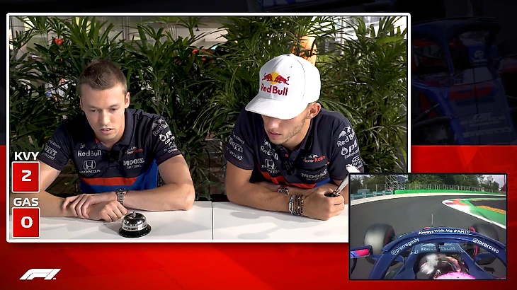 Пьер (без нажатия): Брендон Хартли! (бывший напарник Гасли по «Торо Россо») Брендон Хартли! (пытается нажать на гудок, звонит в звонок Квята). Брендон Хартли.