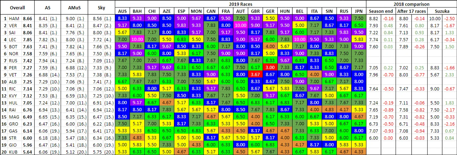 Первая графа — средняя оценка трех изданий за сезон, вторая – баллы от Autosport за сезон, третья – от Auto Motor und Sport за сезон, четвертая – от Sky Sports за сезон. Графа JPN среднее арифметическое от изданий по результатам Гран-при Японии.
