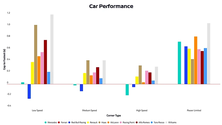 Однако «Мерседес» столкнулся еще и с катастрофической производительностью на прямых и других отрезках, завязанных на мощности: замеры GPS ставит W10 на восьмое место сразу перед «Маклареном» и «Уильямсом». Остальные команды – включая аутсайдеров вроде «Хааса» и «Альфа Ромео» – обогнали машины Боттаса и Хэмилтона по этому показателю. Причем абсолютные цифры отставания от «Феррари» составили уже почти 0,8 секунды. «Ред Булл» проигрывает лишь немного меньше – 0,65 секунды.