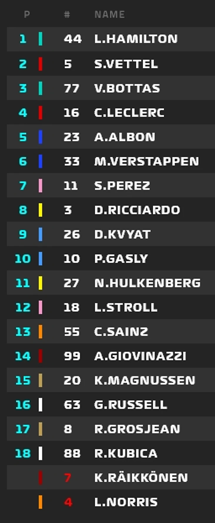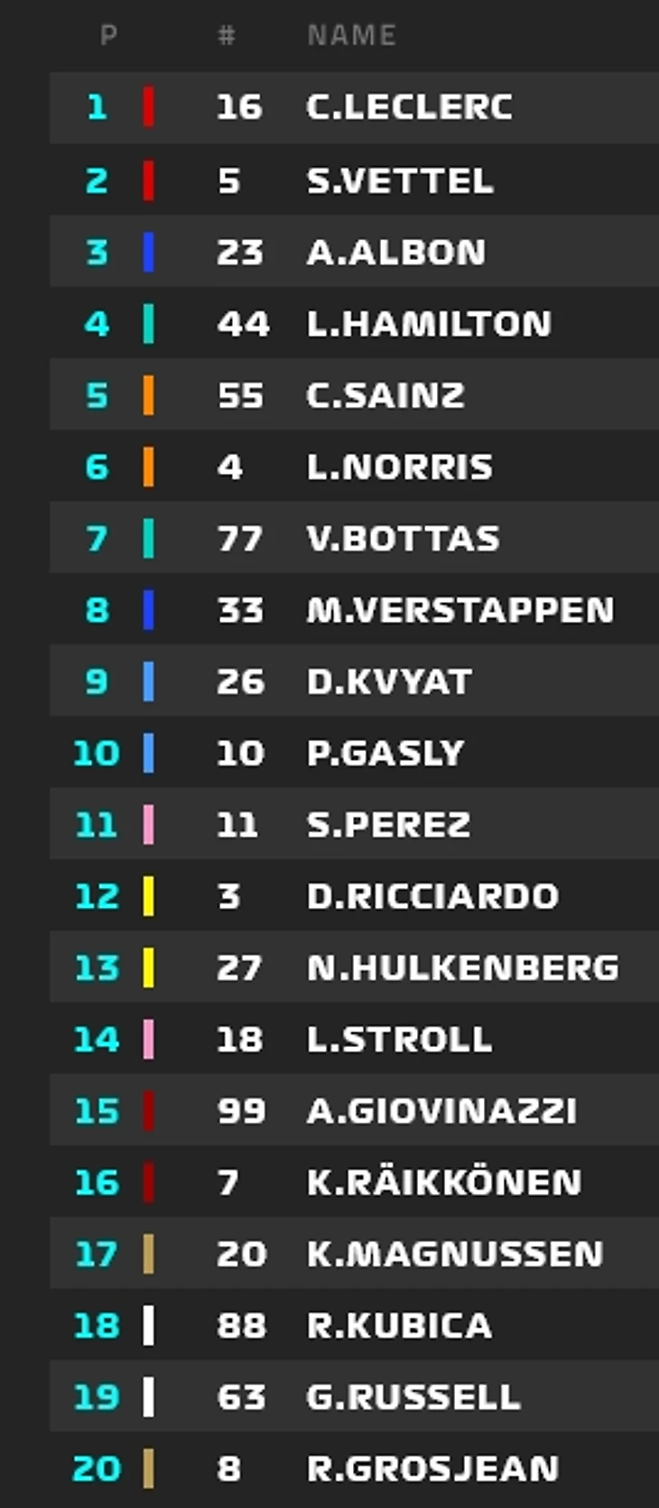 1-й круг Поехали! Леклер удержал лидерство, Феттель – второй, а вот Ферстаппен и Хэмилтон зарубились друг с другом и потеряли очень много времени и позиций! Хэмилтон – пятый, Макс – восьмой! На третье же место прорвался Албон!