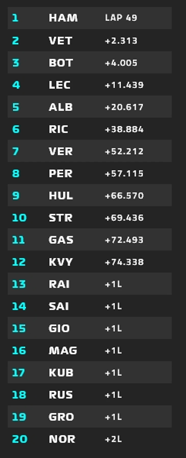 4-й круг Хэмилтон прорвался на четвертое место, предсказуемо разобравшись с Сайнсом. А Ферстаппен чуть дальше рубится с Боттасом за седьмое место!