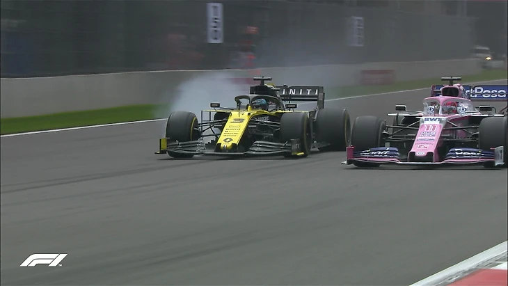 61-й круг Риккардо явно заскучал, пошел в резвую атаку на Переса и заблокировал колеса на торможении! В результате «Рено» пришлось проехаться по траве.