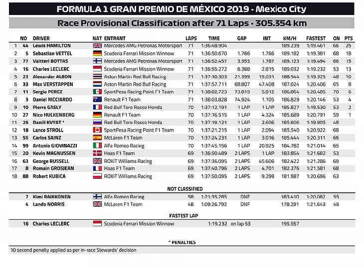 В итоге Ферстаппен, установивший в Мехико рекорд трассы, получил штраф в виде потери трех позиций и откатился на четвертое место. Впереди него стартуют пилоты «Феррари» Шарль Леклер (поул официально теперь у монегаска) и Себастьян Феттель, а также Льюис Хэмилтон из «Мерседеса».