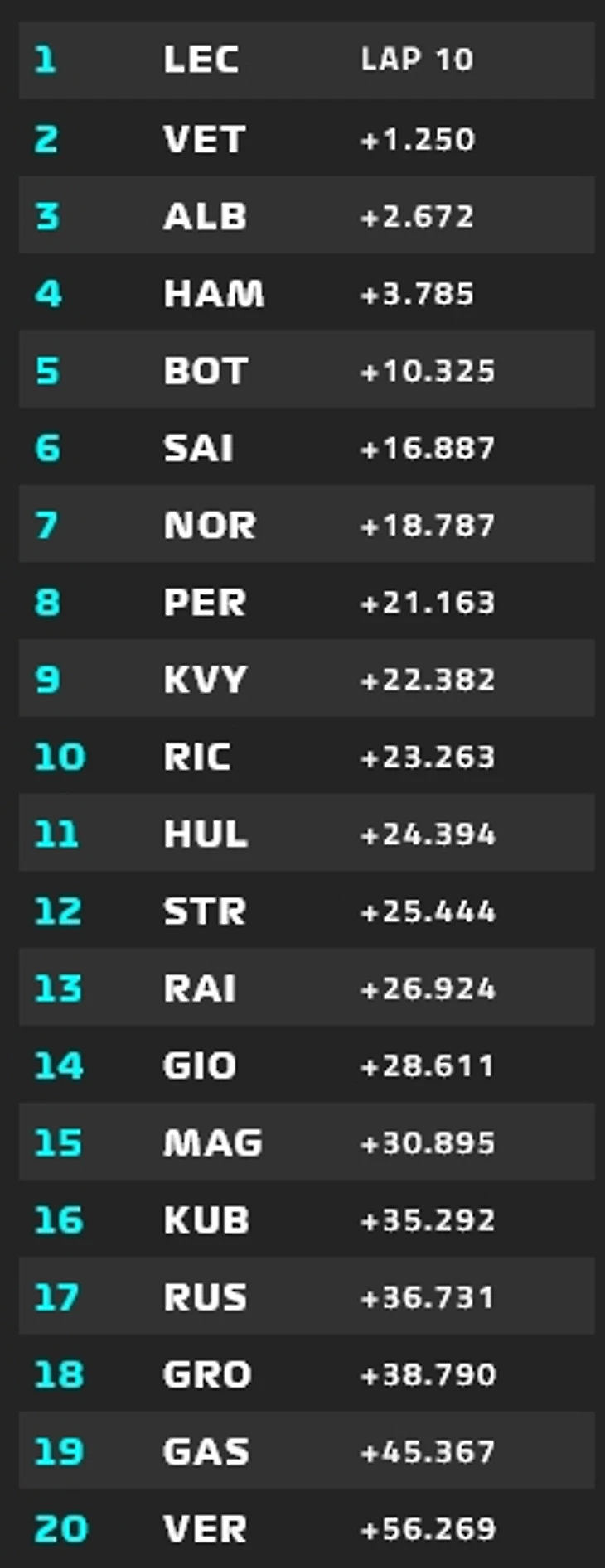 53-й круг Лучший круг гонки снова у Леклера – 1.19,232. До первого места меньше 10 секунд.