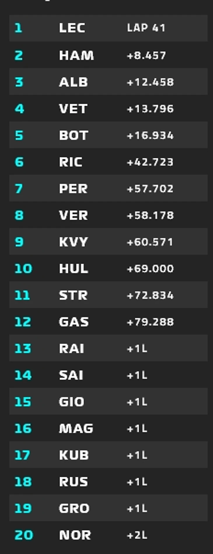 59-й круг Небольшая ошибка от Леклера при обгоне Квята на круг! Шарль потерял около секунды.