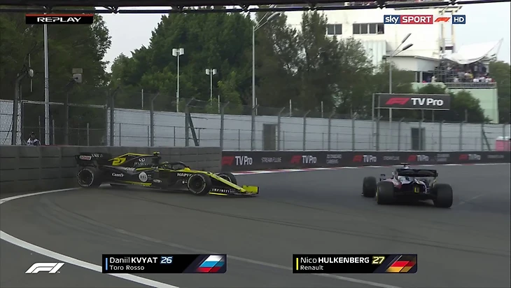 23:50 Квят и Хюлькенберг столкнулись в последних поворотах! Оооо, похоже Даниил схлопочет штраф – «Рено» немца развернуло, он остановился.