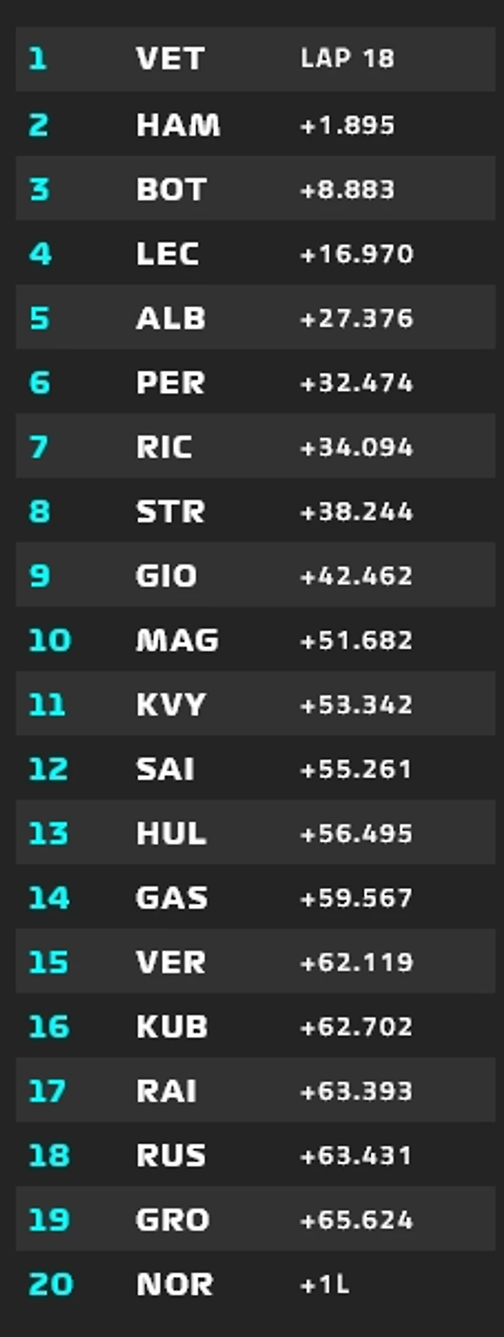 Последний круг. Хэмилтон держит отрыв в 1,8 секунды от Феттеля. Хорошая новость про Квята – он теперь 10-й, мешавший ему Стролл отвалился на 13-е.
