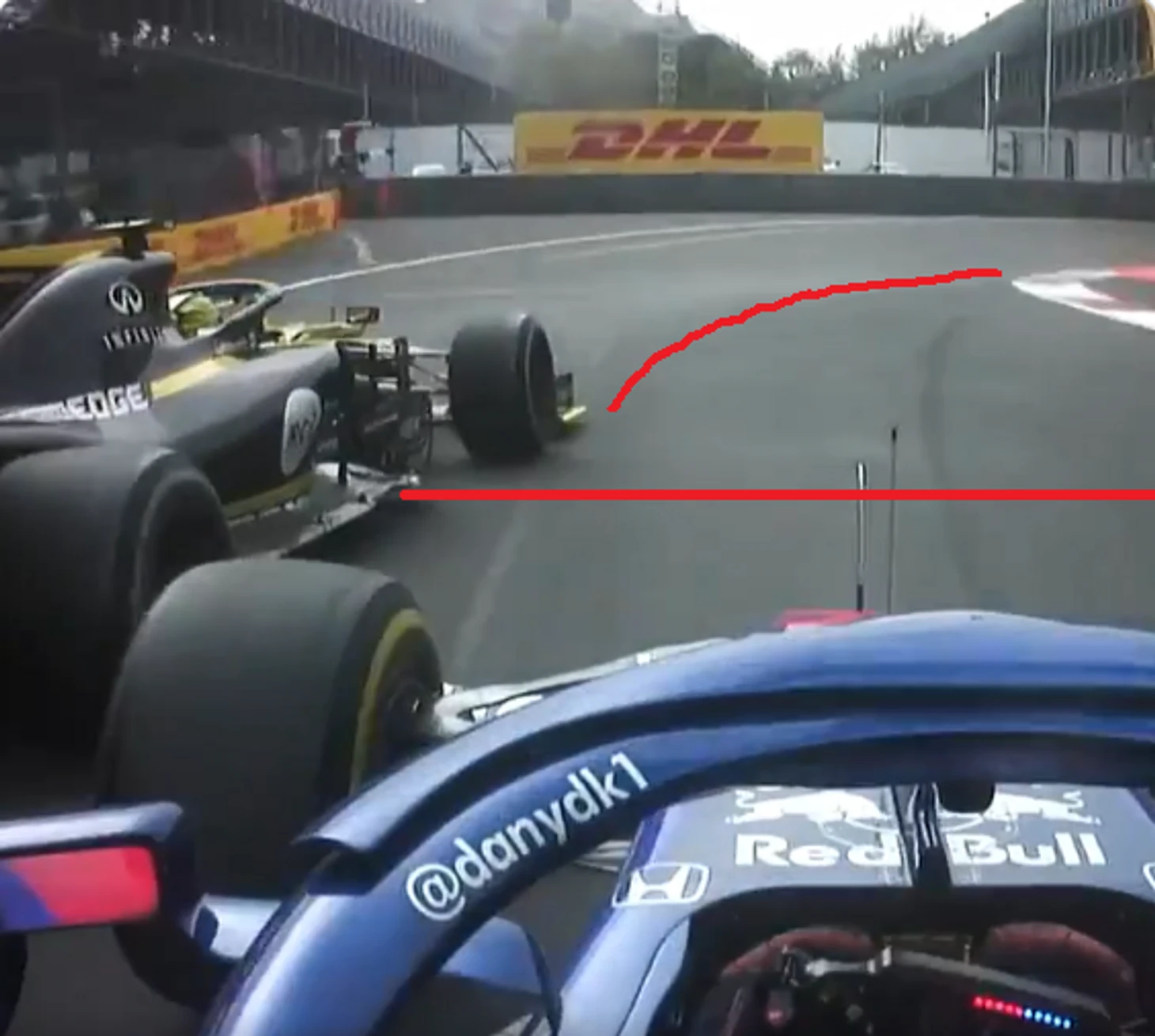 У Даниила было достаточно места для маневра, но в этот момент немец направился к апексу медленного поворота. Если бы пилот «Торо Россо» хотел получить шанс на обгон – ему стоило к этому моменту любыми путями оказаться ближе к этому самому апексу (прямая красная линия).
