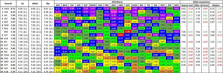 Первая графа — средняя оценка трех изданий за сезон, вторая – баллы от Autosport за сезон, третья – от Auto Motor und Sport за сезон, четвертая – от Sky Sports за сезон. Графа MEX – среднее арифметическое от изданий по результатам Гран-при Мексики.
