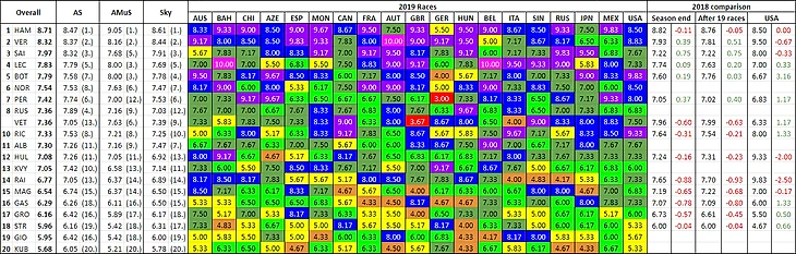 Первая графа — средняя оценка трех изданий за сезон, вторая – баллы от Autosport за сезон, третья – от Auto Motor und Sport за сезон, четвертая – от Sky Sports за сезон. Графа USA – среднее арифметическое от изданий по результатам Гран-при США.
