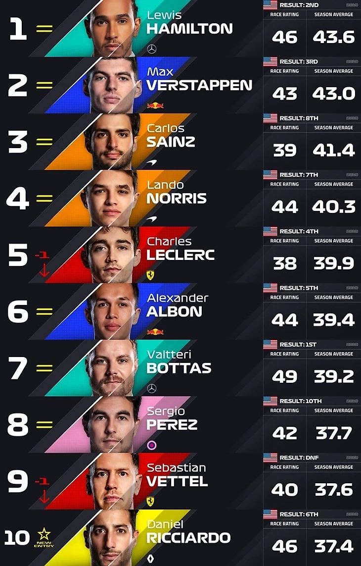 На официальном сайте «Формулы-1» после каждого Гран-при выпускают чарт лучших гонщиков. Его формирует объединение пяти экспертов на основании пяти ключевых характеристик без влияния уровня машины. Оценки экспертов сводят в единый «гоночный рейтинг», с помощью которого в процессе сезона высчитают среднегодовой уровень, а также средний балл ко конкретному этапу.