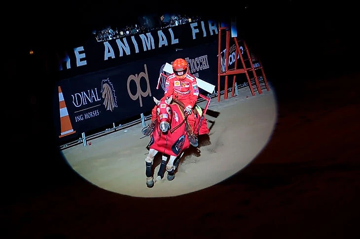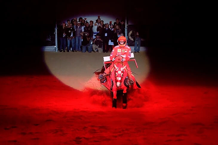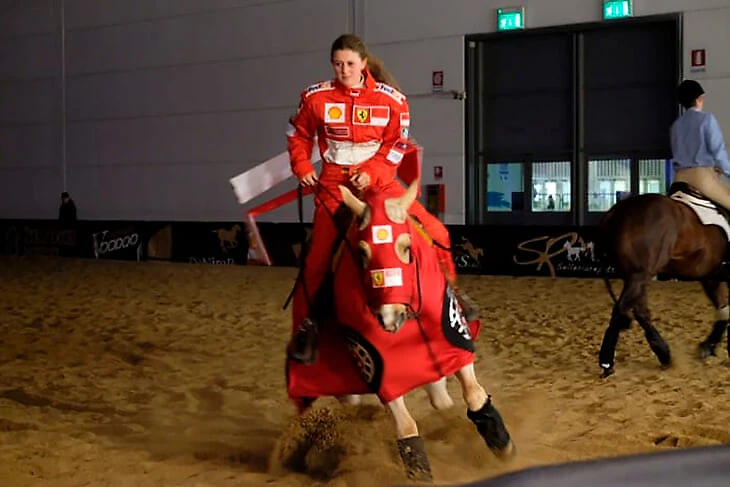 Дочь Шумахера устроила конное шоу в честь Михаэля. Надела шлем и комбинезон «Феррари», а на лошадь – гоночную ливрею Скудерии