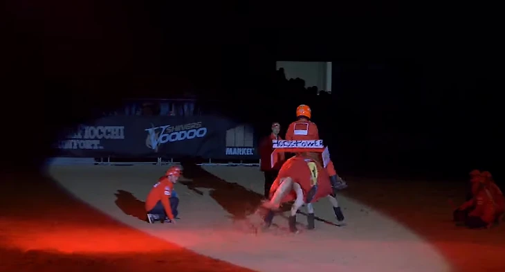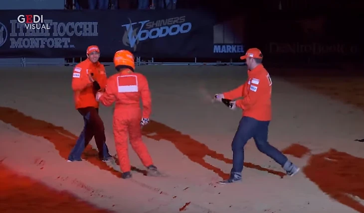 Сперва девушка покрутила пару лошадиных «пончиков», потом совершила пару кругов почета, а потом отправилась на импровизированный пит-стоп – к механикам в форме «Феррари»!