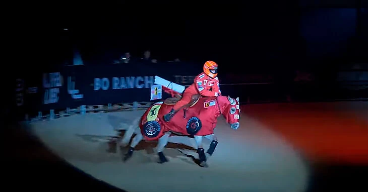 Да, Джина выехала на арену (под Thunderstruck от AC/DC) в шлеме отца, подогнанном под нее комбинезоне «Феррари» из начала 2000-х, с попоной-ливреей Скудерии и огромным антикрылом с надписью «лошадиная сила».
