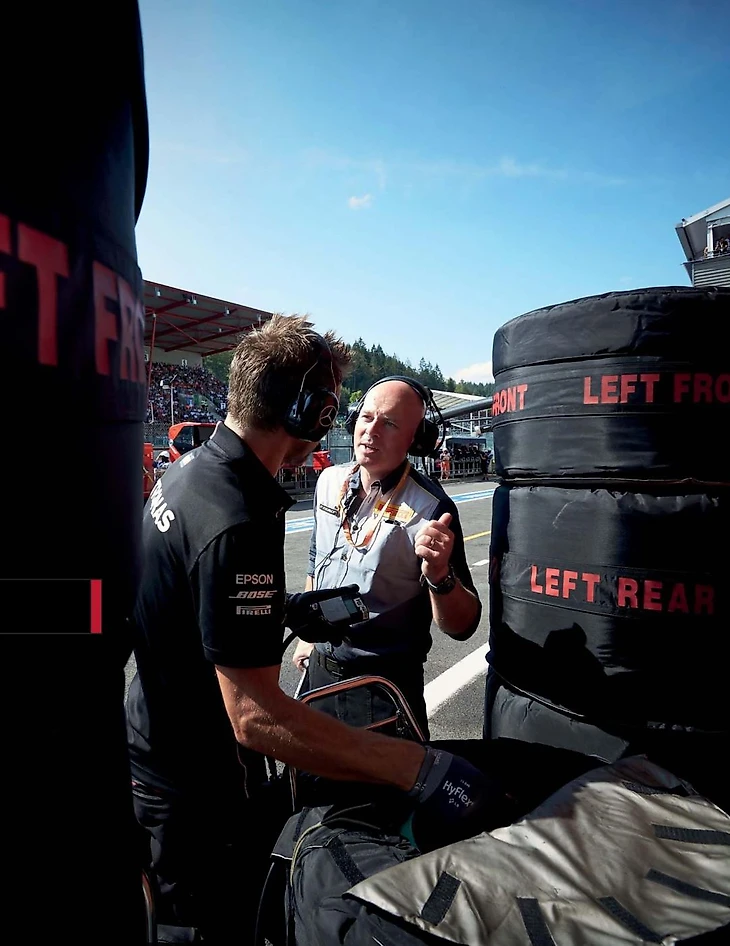 Мэбон проводит все время на пит-лейне и проверяет шины каждый раз, когда машина заезжает в боксы. «Всегда важно увидеть шину, пока она еще не остыла. Это может дать важную информацию к общей картине о ее поведении. Моя роль – быть глазами и ушами команды, ведь у них есть люди, которые работают на базе в Бракли, и им пригодится моя информация. Важно понимать, какая информация полезна, а какая только внесет сумятицу. И тут все решает опыт».