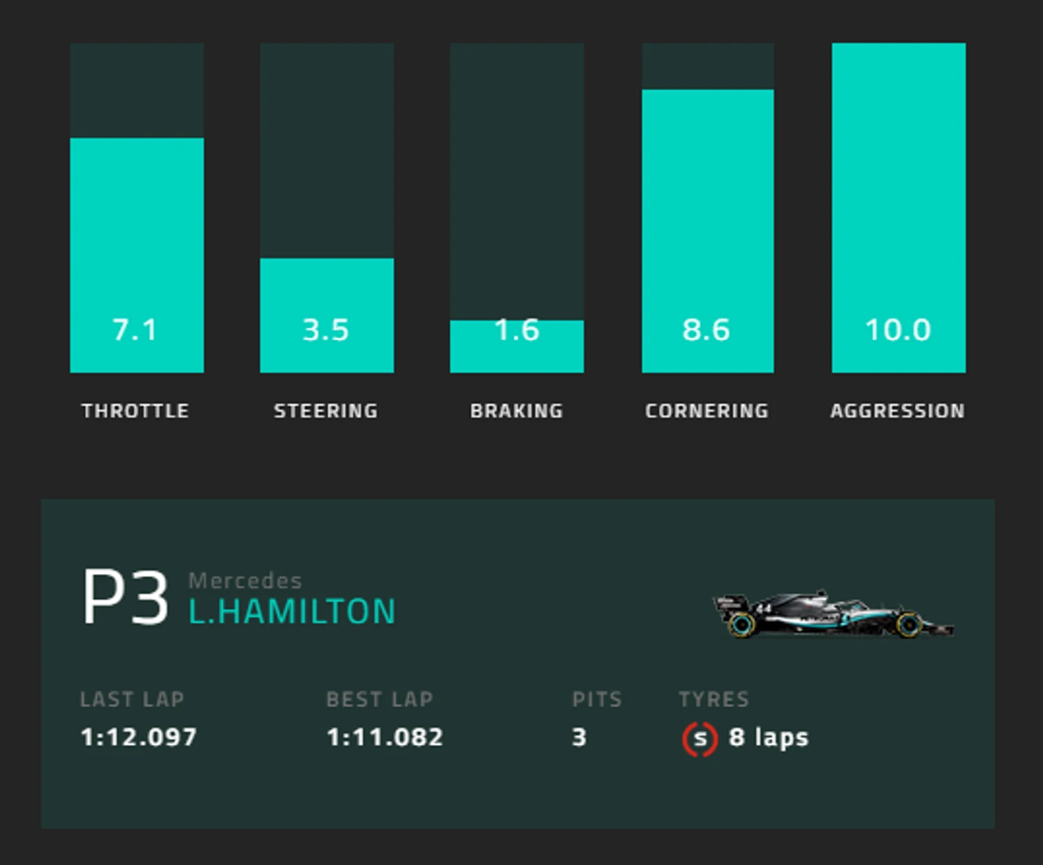 В соответствии с ними лучше всех пилотировал Льюис Хэмилтон из «Мерседеса» – его оценка в 6,2 сложилась из 7,1 за работу с педалью газа, 3,5 за работу рулем, 1,6 за работу на торможениях, 8,6 за прохождение поворотов и 10 (максимальный балл) за «агрессивность». Англичанин бился за второе место за последних кругов, но все испортил столкновением с Алексом Албоном – получил штраф и улетел за пределы топ-5.
