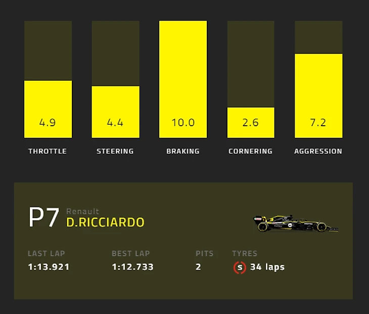 Второе место досталось гонщику «Рено» Даниэлю Риккардо. Его оценка в 5,8 сложилась из 4,9 за работу с педалью газа, 4,4 за работу рулем, 10 за работу на торможениях, 2,6 за прохождение поворотов и 7,2 за «агрессивность». Медоед стал в итоге шестым после старта 11-м и штрафа в 5 секунд на первых кругах из-за контакта с Кевином Магнуссеном.