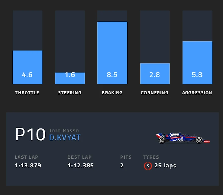 Третье место внезапно занял ставший 10-м Даниил Квят. Его оценка в 4,7 сложилась из 4,6 за работу с педалью газа, 1,6 за работу рулем, 8,5 за работу на торможениях, 2,8 за прохождение поворотов и 5,8 за «агрессивность». Даниил стартовал 16-м.
