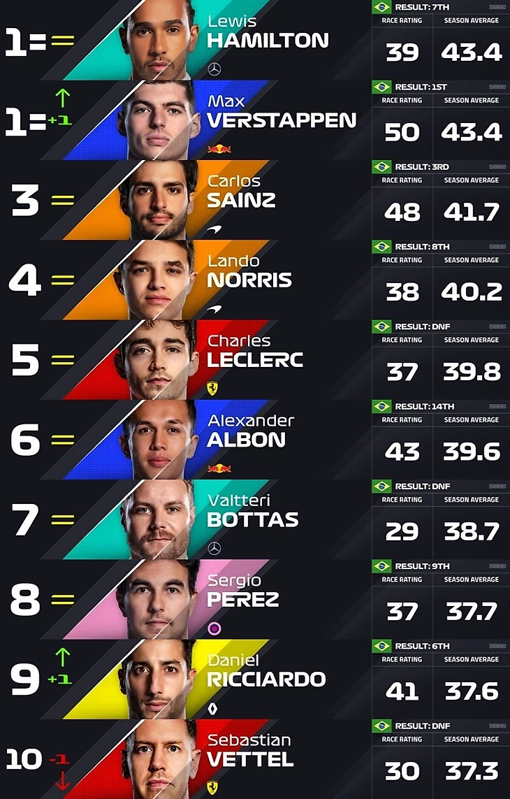 На официальном сайте «Формулы-1» после каждого Гран-при выпускают чарт лучших гонщиков. Его формирует объединение пяти экспертов на основании пяти ключевых характеристик без влияния уровня машины. Оценки экспертов сводят в единый «гоночный рейтинг», с помощью которого в процессе сезона высчитают среднегодовой уровень, а также средний балл ко конкретному этапу.