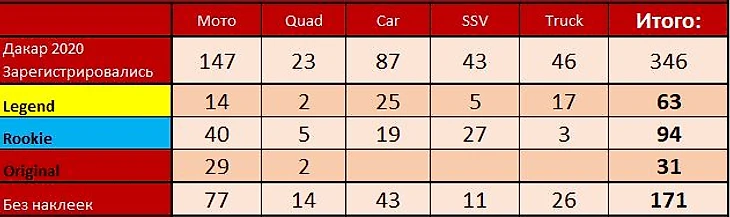 Одним из нововведений Дакара последних лет стало ранжирование участников по группам, путем выдачи, или не выдачи им определенных наклеек. Телеграм канал "Наши на Дакар/Dakar" рассказывает об этом и публикует интересную статистику.