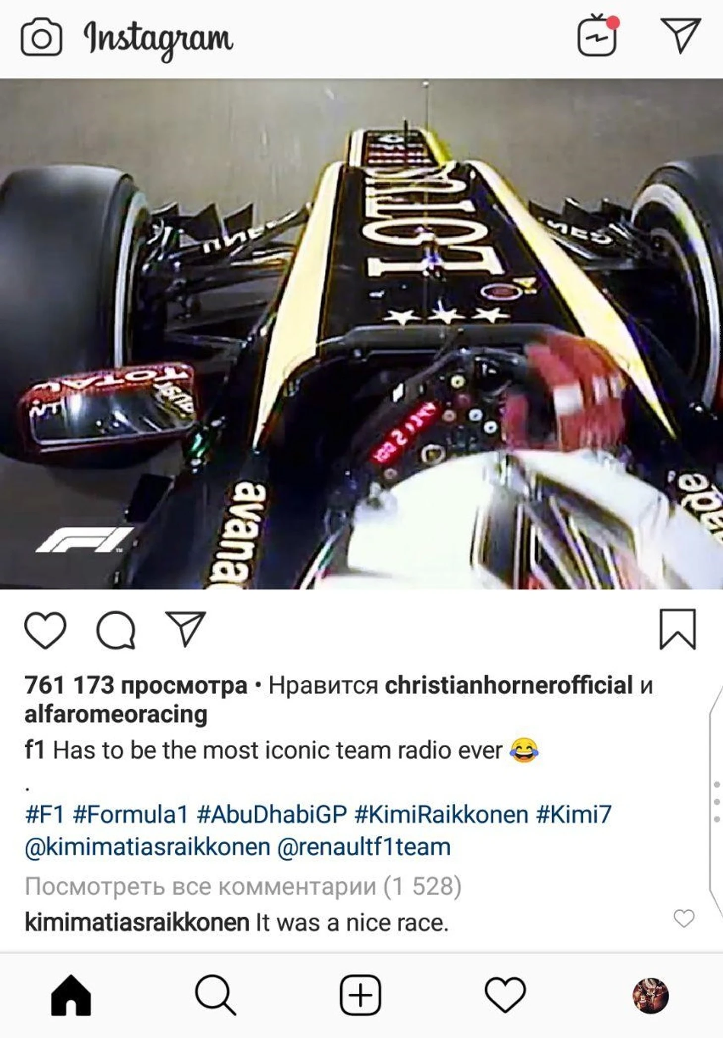 «Это была хорошая гонка», – прокомментировал пост сам Кими в фирменном стиле.