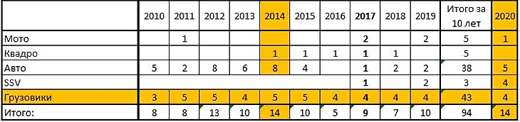 Дакар 2020 начинает новое десятилетие гонки. Телеграм канал "Наши на Дакар" @DakarRussia приводит статистику по прошлому десятилетию. (Если хотите больше информации и оперативно, подписывайтесь на телеграмм канал "Наши на Дакар") Лучший год по числу участников от России был 2014-й. Дакар 2020 повторяет лучший 2014-й год. Меньше всего было в 2016-м году. В 2017-м первый год, когда мы участвовали во всех зачетах. Больше всего участников за 10 лет у нас в грузовом зачете. При чем в 2012-м Дмитрий Павлов выступал на Мерседесе (57-е место), а в 2015-м Максим Кирпилев на МАНе (Сошел). Все остальные от Камаз-Мастер.