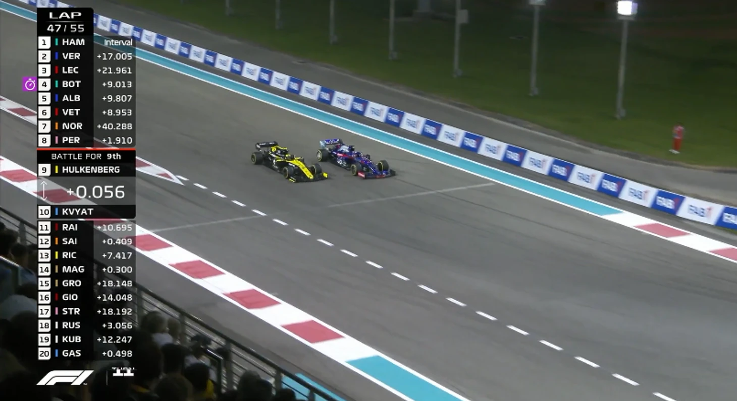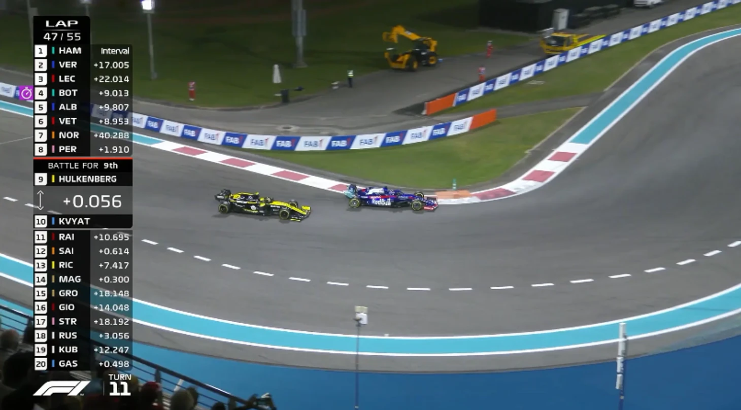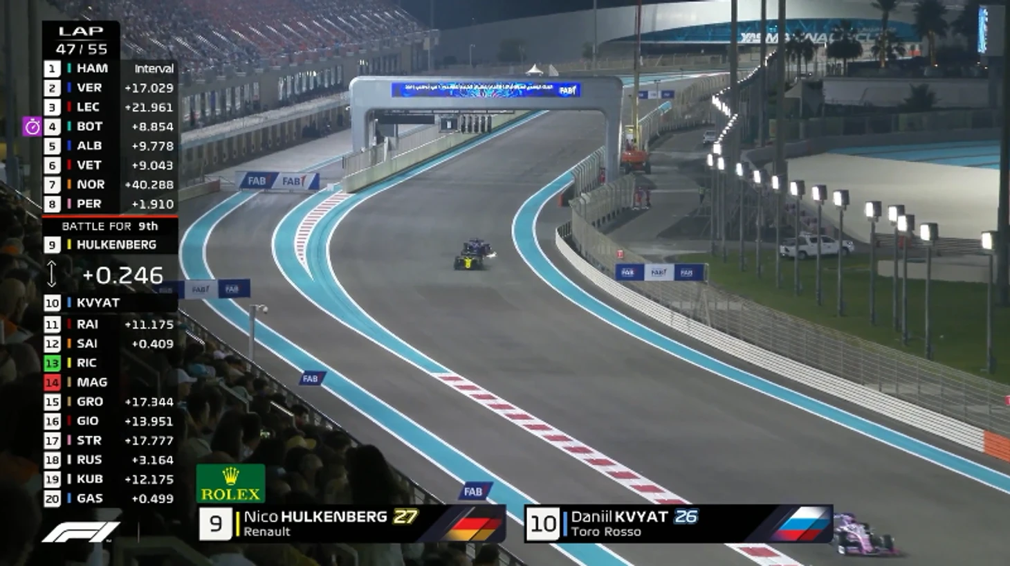 Сразу после выезда из боксов перед Квятом оказался бывший напарник по «Ред Булл» Даниэль Риккардо – и пилот «Торо Россо» прорвался мимо него с первой же попытки без потери времени. Следующей целью в борьбе за топ-10 стал напарник Медоеда Нико Хюлькенберг – на разборку с ним у №26 тоже ушло всего два круга.