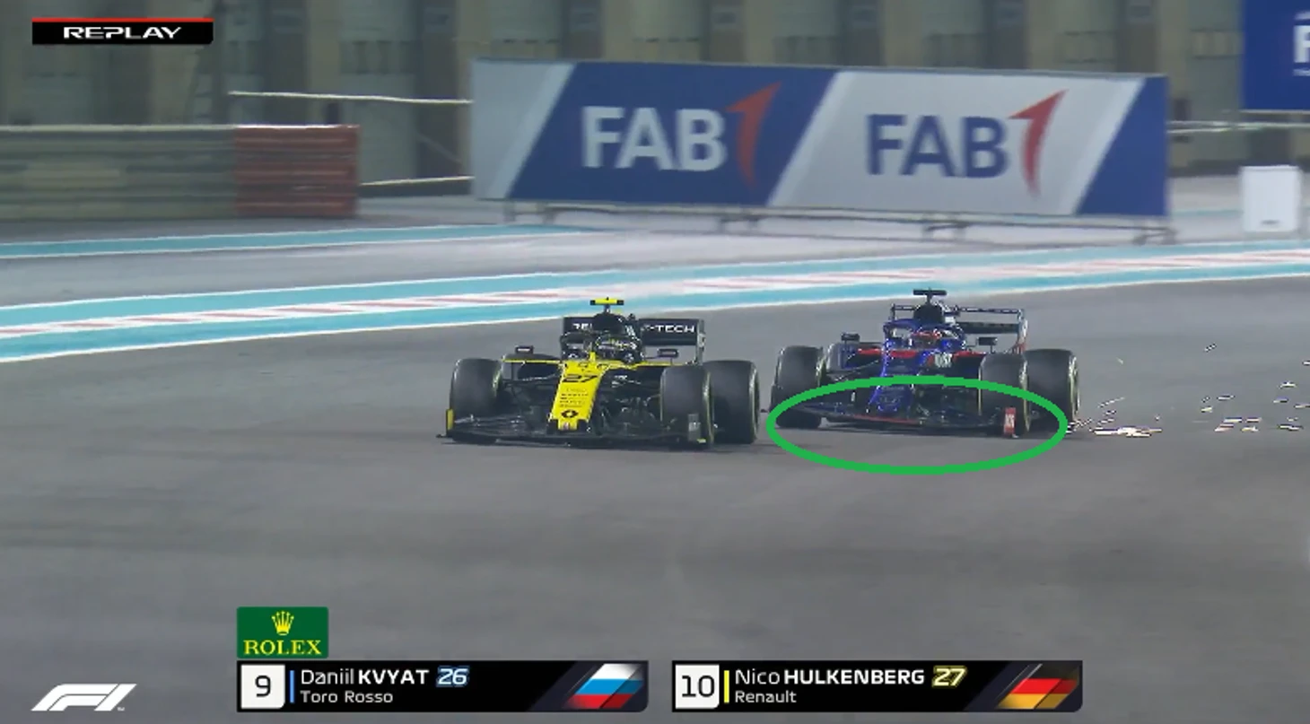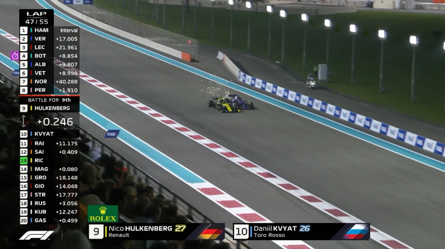 Однако в борьбе с Нико на 46-м круге Даниил повредил переднее антикрыло – только посмотрите, в каком состоянии его машина выезжала из-за «Рено» Хюлькенберга перед решающим обгоном! Деталь явно сворочена набок и высекает искры об асфальт, замедляя болид.
