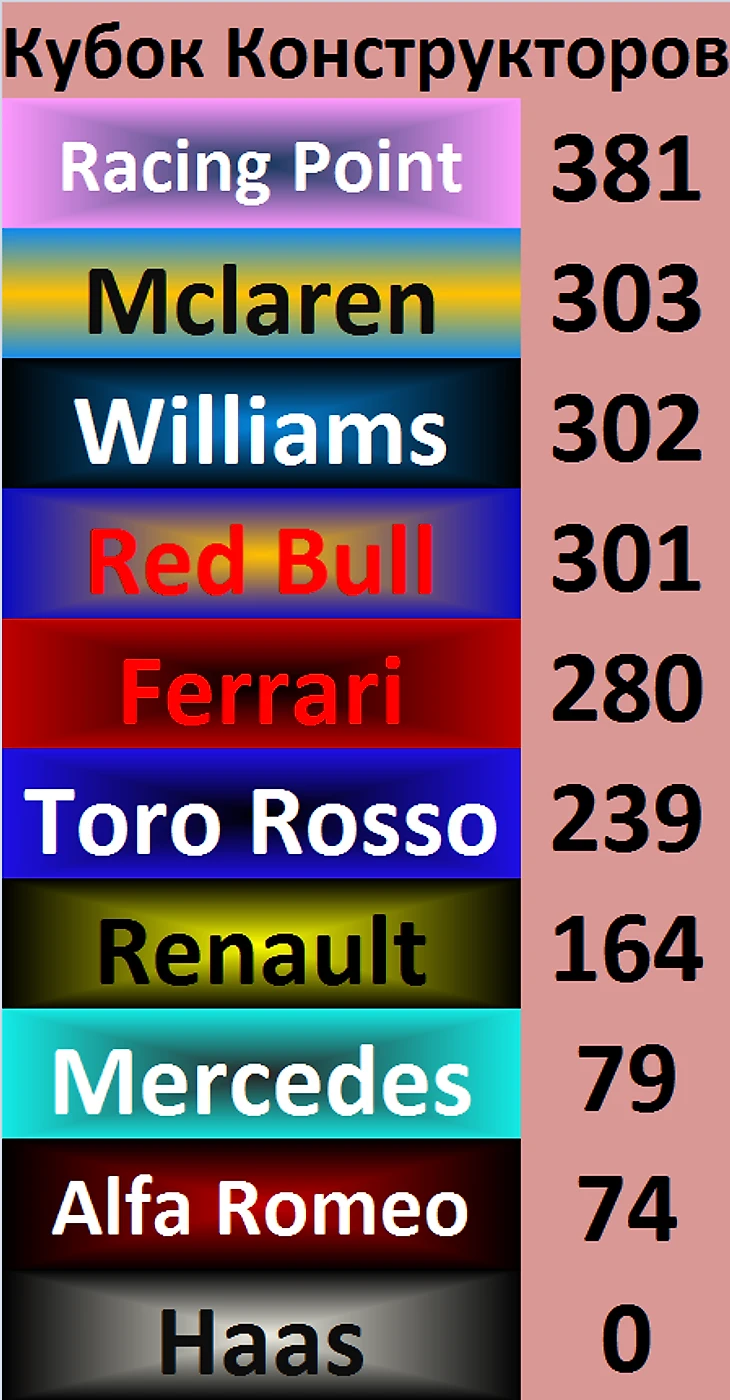 Пк-Хэмилтон(5) Лк-Хэмилтон(5) Нп-Риккьярдо 1.Хэмилтон(25) 2Леклер(18) 3.Ферстаппен(18) 4.Ботас(25) 5.Феттель(25) 6.Албон(25) 7.Гасли(0) 8. Риккьярдо(12) 9.Хюлькенберг (12)10.Сайнс(25)