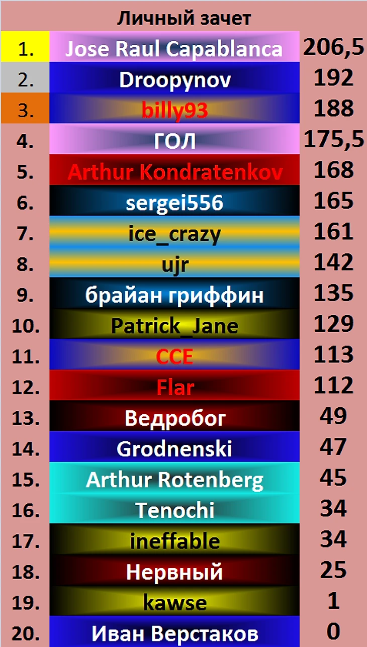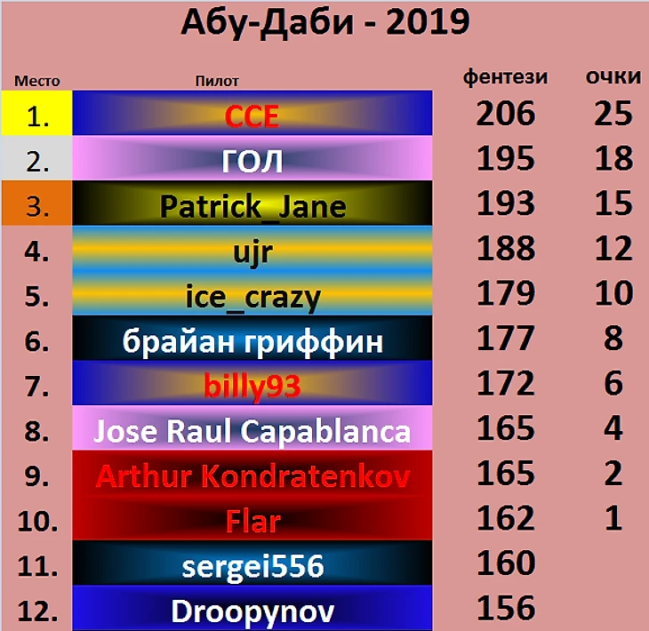 Пк-Ферстаппен Лк-Албон Нп-Боттас(5) 1.Ферстаппен(18) 2Хэмилтон(18) 3.Леклер(25) 4.Феттель(18) 5.Албон(18) 6 Боттас(15) 7.Гасли(0) 8. Сайнс(15) 9.Перец(15) 10.Квят(18) droopynov 156 ПК Ферстаппен, ЛК Боттас, НП Боттас.(5)