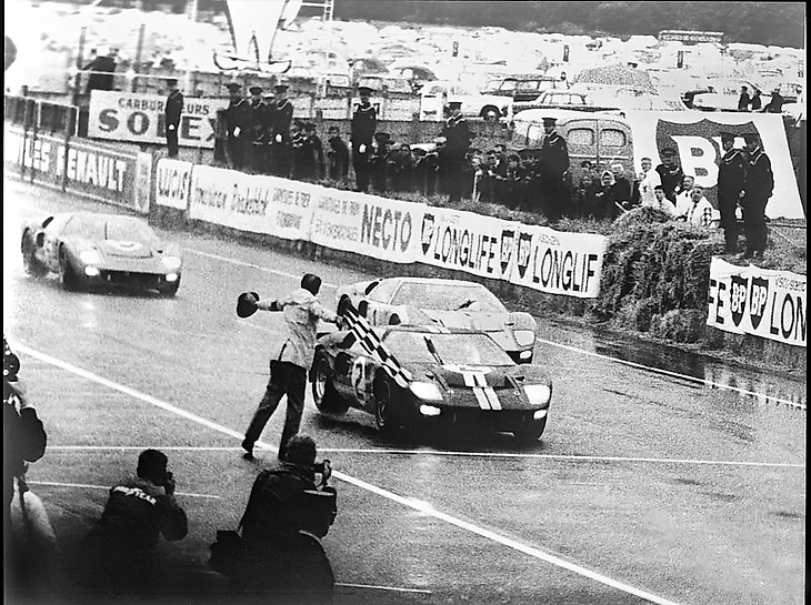 250 000 зрителей собрались в тот день в 1966 году в Ле-Мане, чтобы наблюдать сражение двух великий компаний. Генри Форд открывал гонку 1966 года – его взмах стартовым флагом начал историю, автором которой он сам и хотел быть. Машины Ford лидировали с самого старта и создали комфортный отрыв. И это даже несмотря на столкновение Майлза с Джоном Уитмором из Alan Mann Racing Ford, после которого ему пришлось заехать в боксы после самого первого круга. Чтобы отправить его снова в гонку, потребовалось как следует захлопнуть разболтавшуюся дверь. Ford занимали три первых места после первого часа, Дэн Герни вел за собой 13 машин «голубого овала», одна из которых обязана была выиграть. Машина Герни и Гранта боролась за лидерство всю ночь, но под утро температура двигателя устремилась вверх и им пришлось сойти, оставив Майлза в единоличных лидерах.
