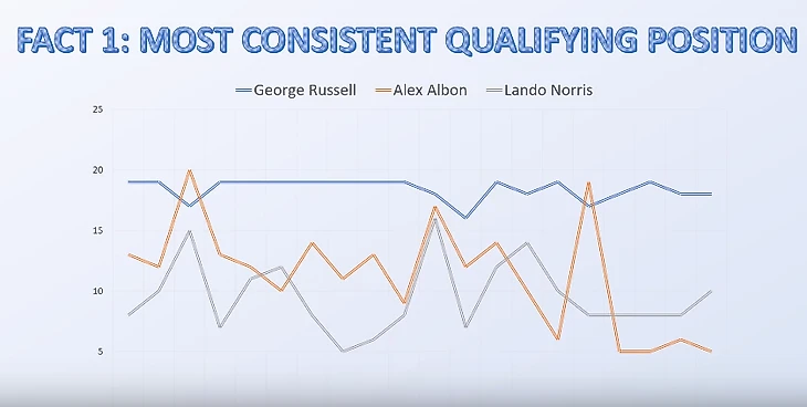 ДР: Я – синяя линия, Алекс – оранжевая. Ландо – серая. (Показывая на момент выше Албона ближе к концу графика (должно быть, Гран-при России – там таец разбил машину и был 19-м, а Джордж – 17-м). Алекс, это что? Как так вышло вообще? Как мы знаем, в «Формуле-1»…