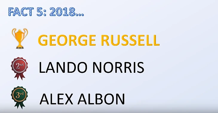 ДР: Я квалифицировался на 19-х местах. У меня были люди позади! Факт четыре: как мы все знаем, в «Формуле-1» многое зависит от машин. Теперь – «Формула-2» 2018 года (моносерия – Sports.ru): третий – Алекс Албон. Второй – Ландо Норрис. Первый: Джордж Расселл.