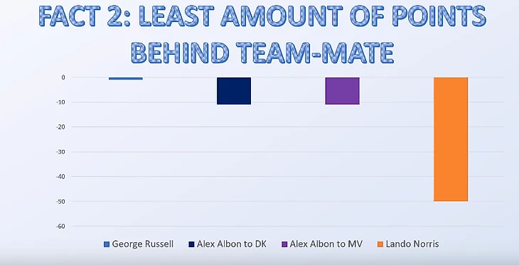 (Ключ: голубой столбик – отставание Расселла от Кубицы (1 балл), синий – отставание Албона от Квята (12 очков), фиолетовый – отставание Албона от Ферстаппена (12 очков), оранжевый – отставание Норриса от Сайнса (47 очков).