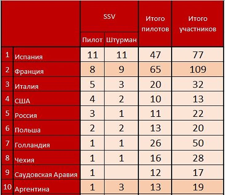 На 2 страны представителя больше среди штурманов зачета SSV. 19 стран на 44 штурмана, Испания и Франция во главе списка, а Россия занимает 8-е место, или вернее сказать делит его с остальными 12-ю странами. У всех по одному штурману.