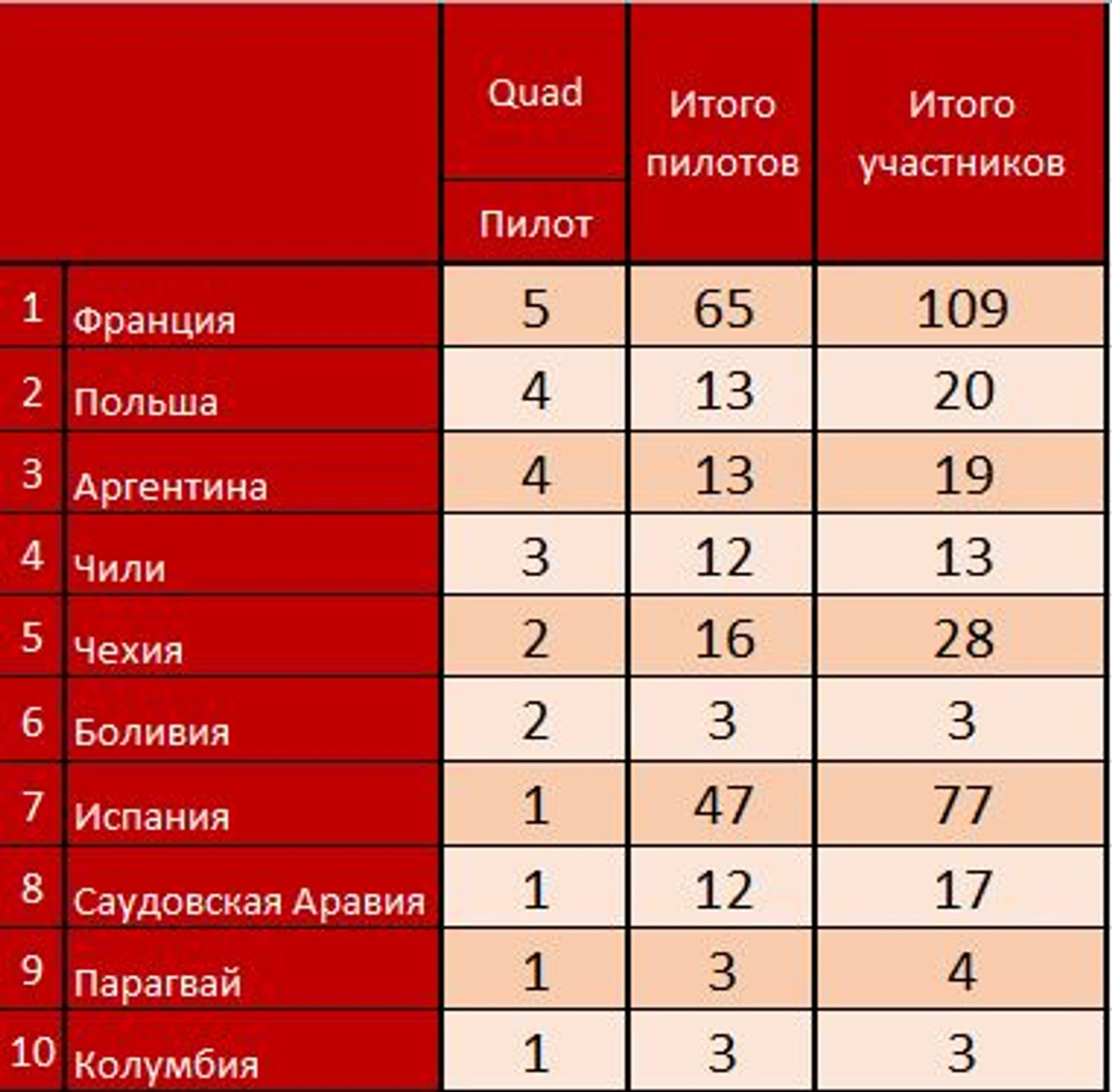 17 стран участниц и 44 экипажа. Гегемонию французов перехватывает Испания с 11 пилотами, но Франция идет вслед за ними с восемью пилотами. Россия тут 5-я и у нас 3 пилота. Есть женский Итало-немецкий экипаж.