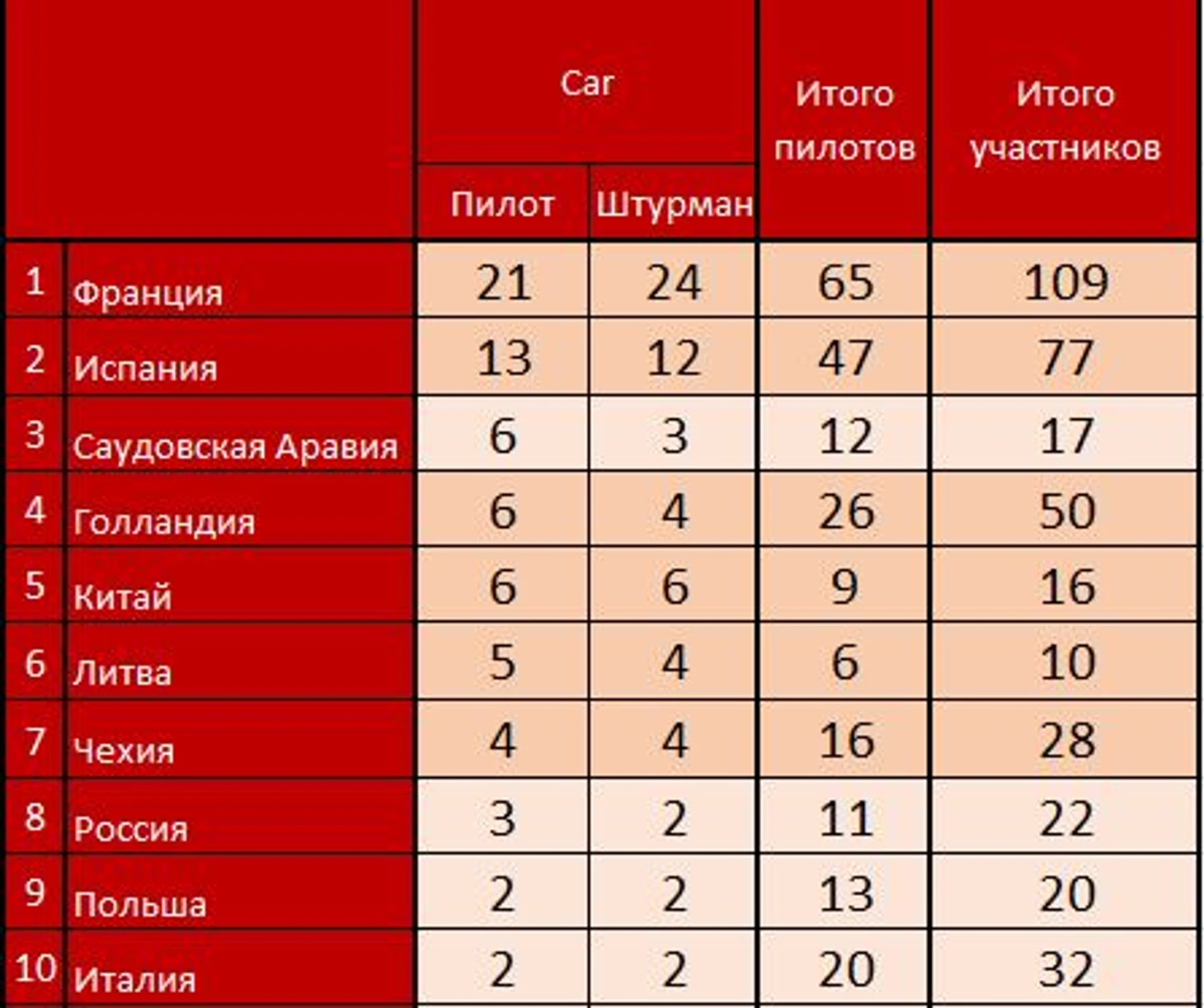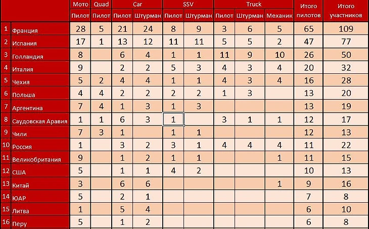 Самая многочисленная страна на Дакар, это конечно же Франция, 109 участников (пилоты, штурманы и механики в грузовом зачете.) В ТОП 3 входит Франция, Испания и Голландия. Россия замыкает 10-ку с 22-мя участниками. Женщин насчитывается 9 представителей, что меньше прошлогоднего участия на 6 человек. В связи с переездом на Аравийский полуостров Дакар потерял в участников из южной Америки, но приобрел из африканского континента.