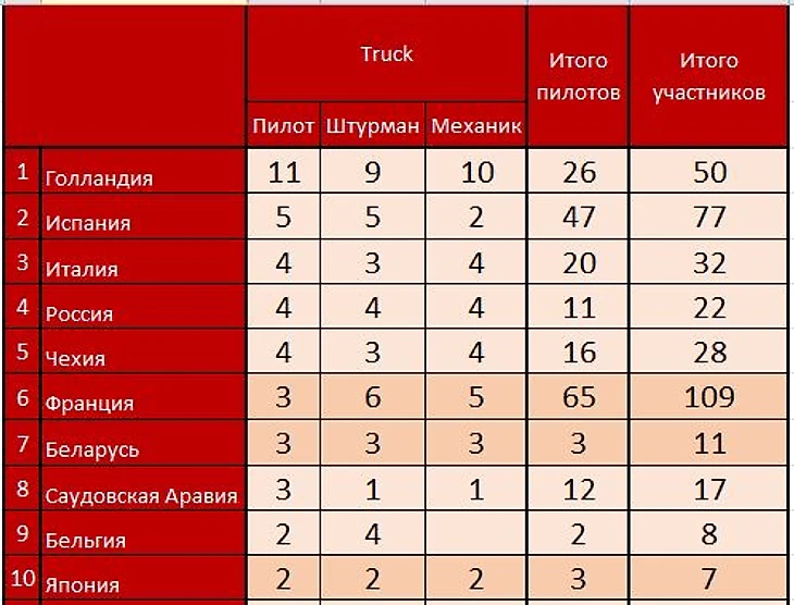 Совсем другая картина обстоит в зачете грузовиков. Тут лидер Голландия, как по числу пилотов, так и по штурманам , и механикам. Второе место по пилотам занимает Испания, а третью строчку делят Италия, Россия и Чехия. Бессменный лидер других зачетов Франция тут 6-я, но отыгрывается на штурманах, 2-я и механиках, тоже 2-я. Россия среди пилотов, штурманов и механиков всегда делит 3-ю строчку с другими странами. Женщин в грузовиках нет. Дакар собрал пилотов из 14-ти стран, Штурманов из 13-ти и механиков из 15-ти стран.