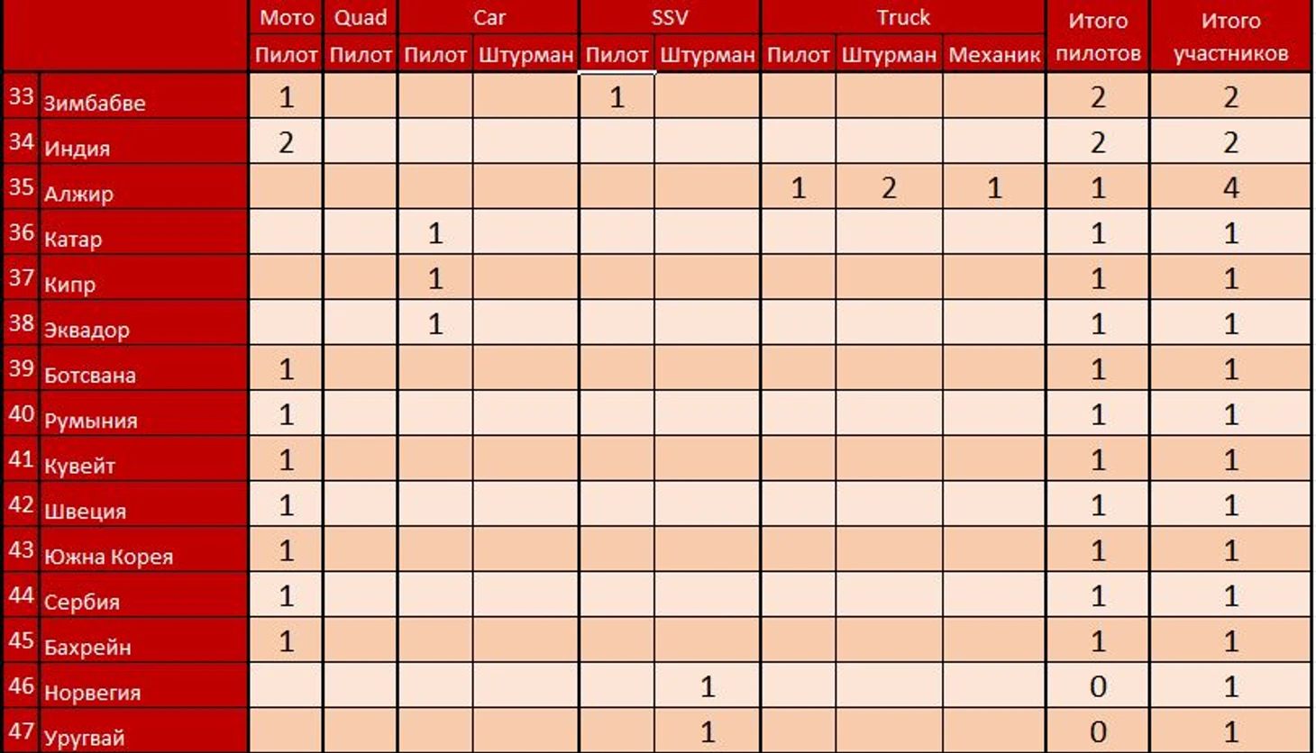 Дакар на сегодня собрал пилотов из 45-ти стран, штурманов из 50-ти. Есть среди них довольно экзотические страны, типа Кувейта, Бахрейна, Зимбабве.