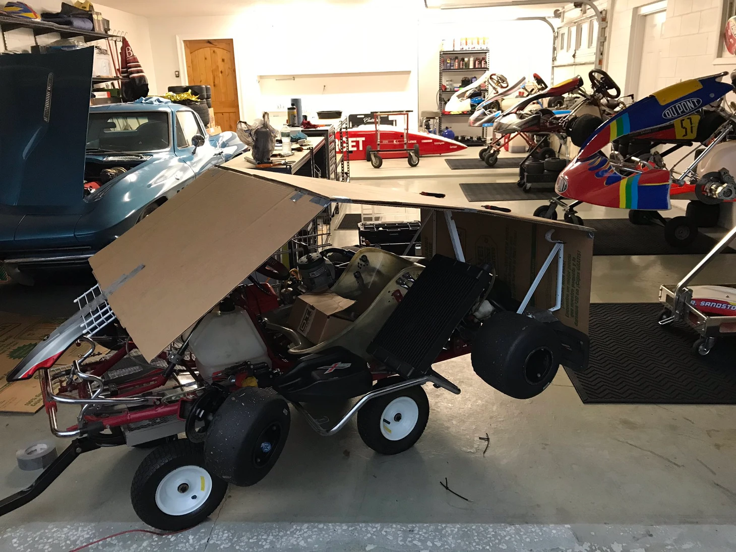 Как видим, в ход пошли коробка из-под холодильника, изолента, разобранная тележка из гипермаркета, фольга и немного мусора из гаража.