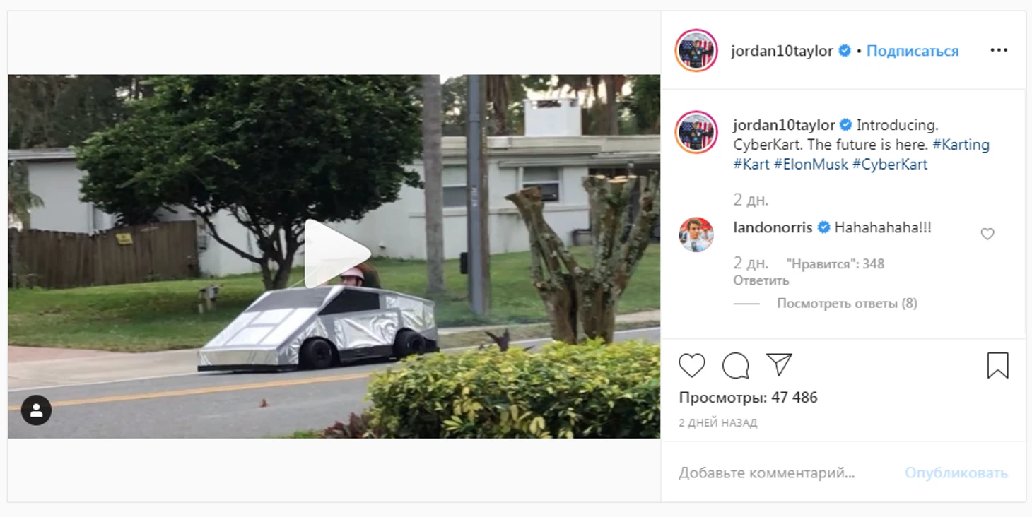 Но смешнее всех выступил американский гонщик Джордан Тэйлор – чемпион «Ле-Мана» в классе GTE Pro, двукратный победитель «24 часов Дайтоны» и чемпионата США в классе суперкаров. Он просто создал собственную версию Cybertruck из карта – CyberKart.