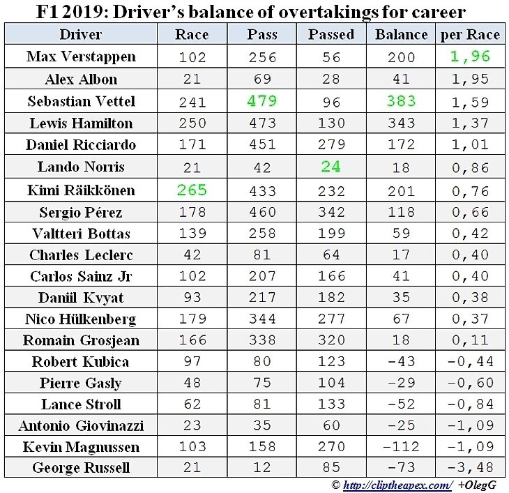К сожалению детальная статистика по обгонам велась на сайте cliptheapex только начиная с 2004 года. Поэтому у Райкконена в данной таблице учтен не весь его стаж в Формуле 1, а только 265 гонок. Впрочем, Кими - единственный гонщик из действующих, кто начинал карьеру раньше, чем сезон 2004.
