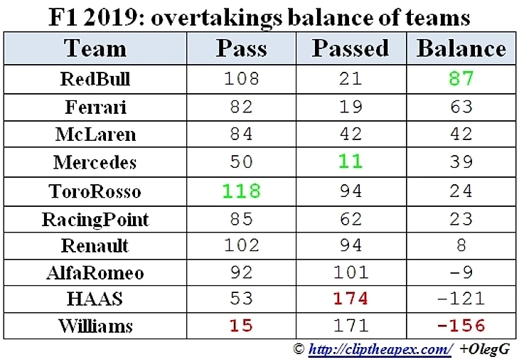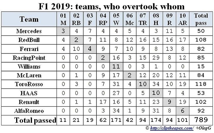 Не трудно догадаться, что в этой таблице по диагонали - "внутрикомандные" обгоны. Естественно, изменение позиций на трассе по указанию командного мостика, т.е. без очевидной борьбы, в данную статистику не входят.