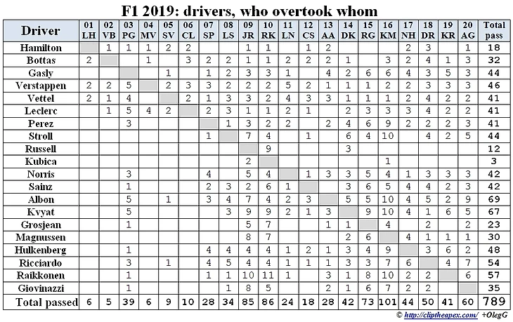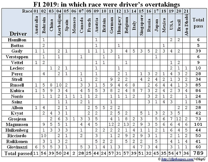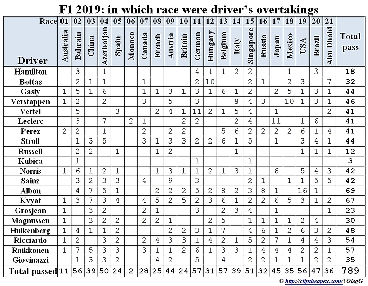 Теперь можно свести полученные данные в сводные таблицы, чтобы иметь представление о том, кто и сколько обгонял. Итак, в сезоне я насчитал 789 обгонов. Вполне возможны незначительные неточности: далеко не все попадает в трансляцию и соответственно можно, что-то пропустить или ошибочно засчитать. Но количество таких неточностей на общем фоне минимально. Для желающих проверить доступна детальная информация по обгонам в каждой гонке.