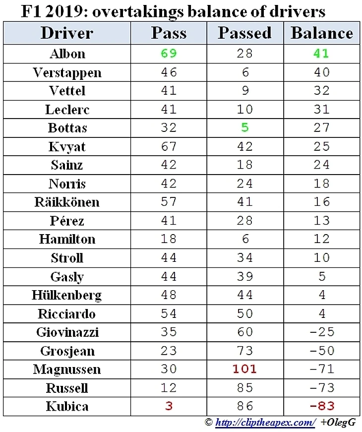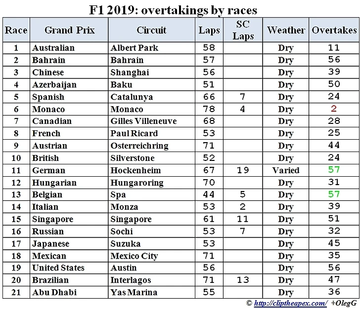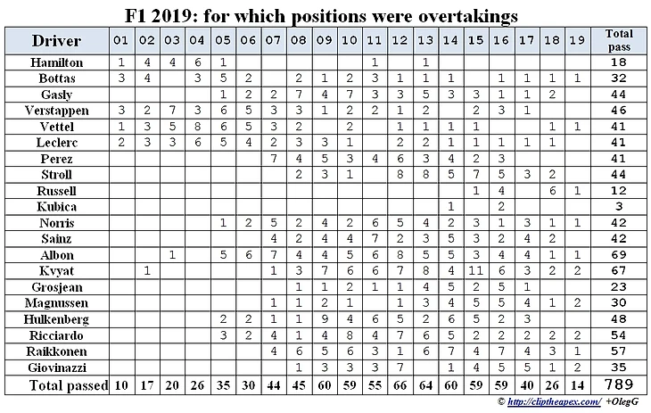 По ходу сезона 2019 после каждой гонки собирал информацию по обгонам. Для этого использовал покруговку гонок с официального сайта ФИА, дополненную информацией из трансляций.
