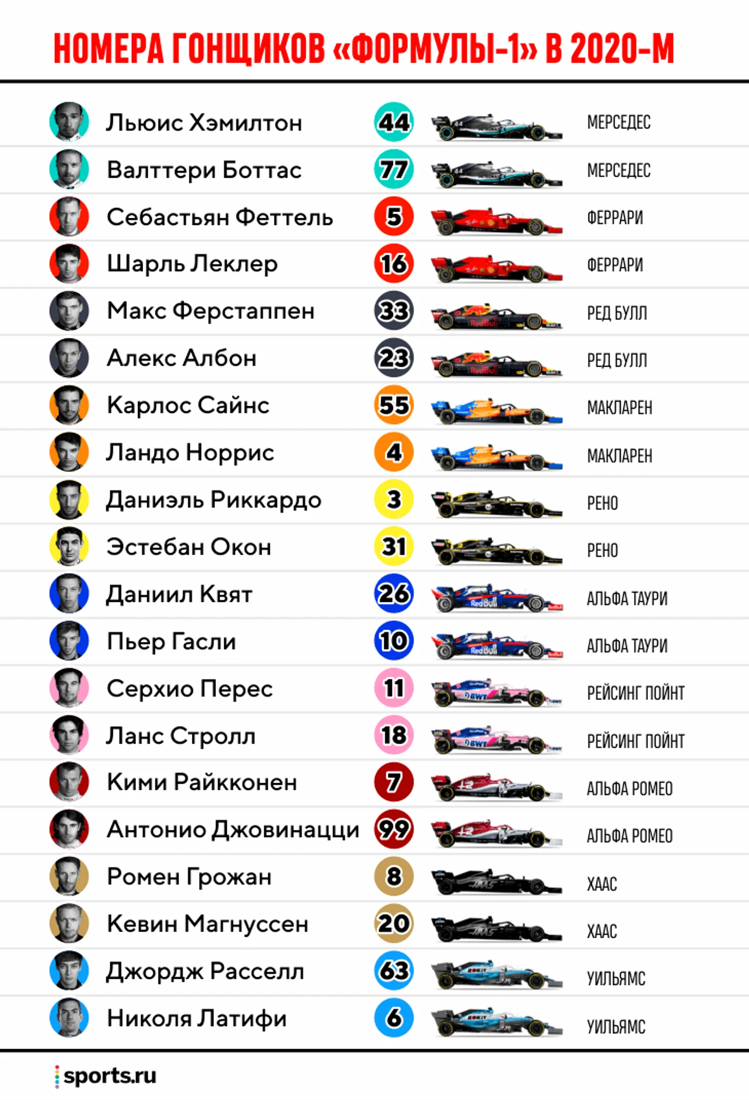 13 марта стартует в Австралии новый сезон «Формулы-1» – к тому моменту всем пилотам требовалось определиться с номерами для чемпионата-2020. Прежде всего это касалось новичка «Уильямса» и сына канадского миллиардера Николя Латифи – у него пока не было постоянного номера в Гран-при, и он мог выбрать любое не использованное за последние три года число от 2 до 98. В итоге вице-чемпион «Ф-2» остановился на «шестерке», с которой раньше гонял чемпион 2016 года Нико Росберг – с момента конца карьеры главного и самого успешного соперника Льюса Хэмилтона последних лет прошло уже три года, а потому его номер снова вернулся в общий доступ.